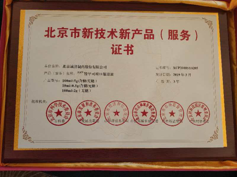 2019年4月北京誠(chéng)濟(jì)制藥股份有限公司的貝靈?羧甲司坦口服溶液進(jìn)入第九批“北京市新技術(shù)新產(chǎn)品(服務(wù))”名單,獲得“北京市新技術(shù)新產(chǎn)品(服務(wù))”?證書。